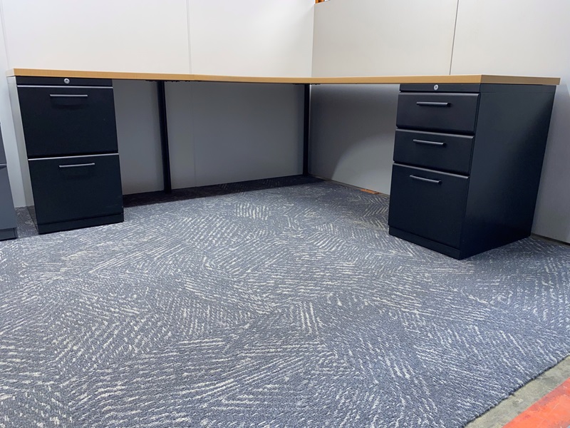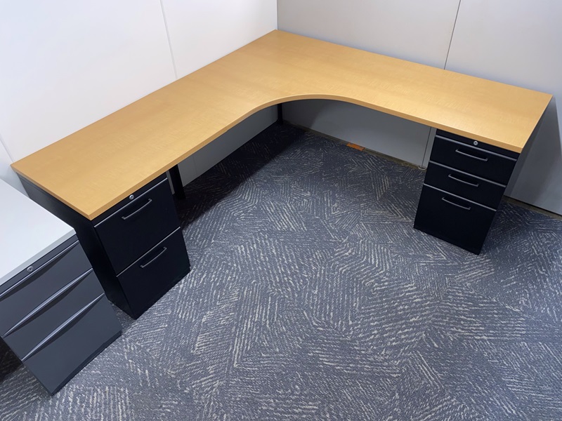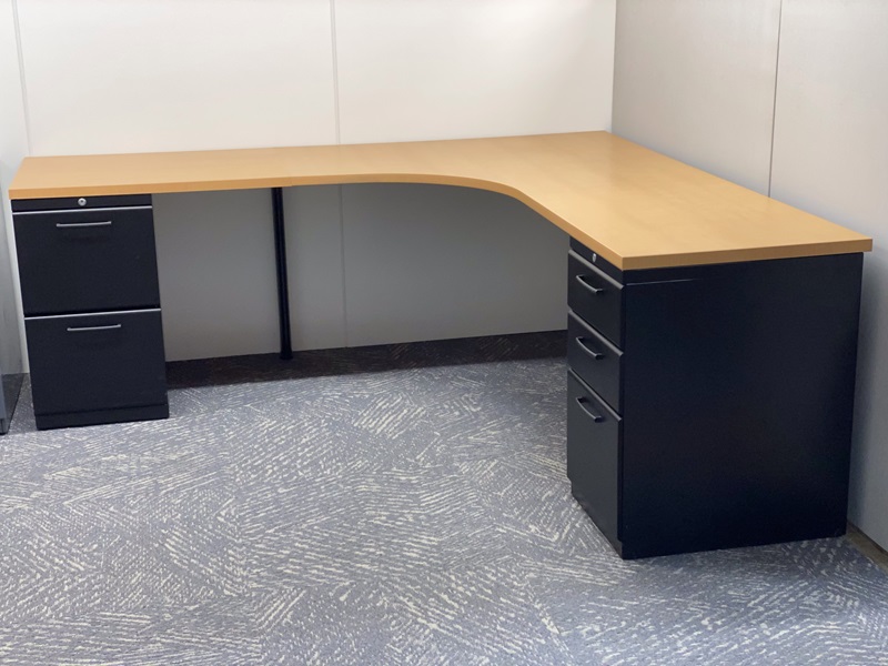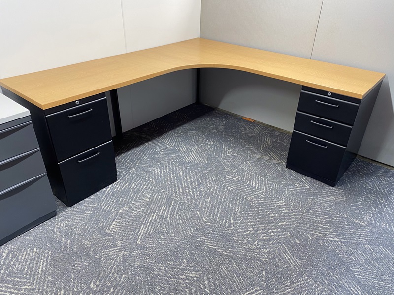 Corner Desk 77" x 71" with two locking pedestal drawers.