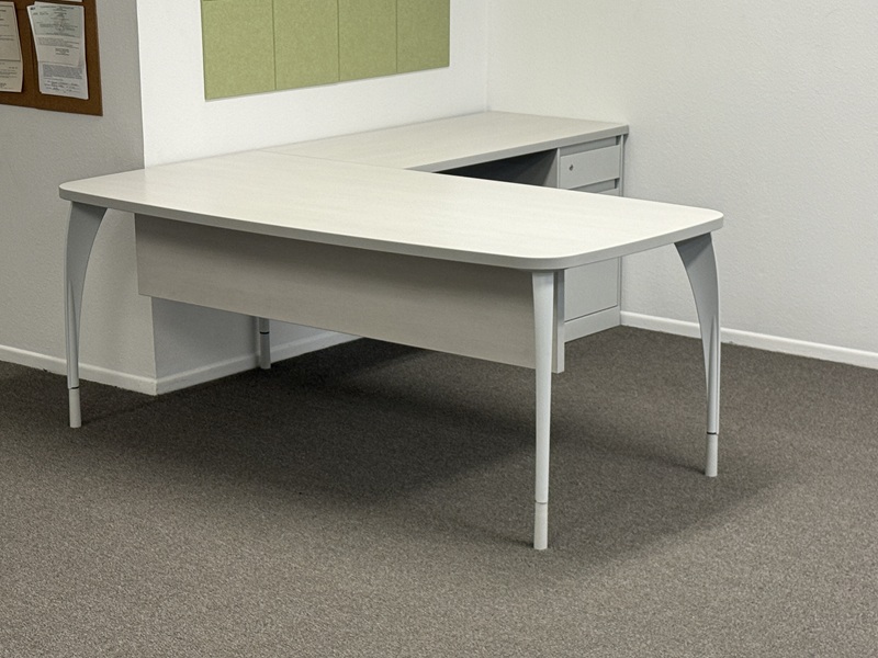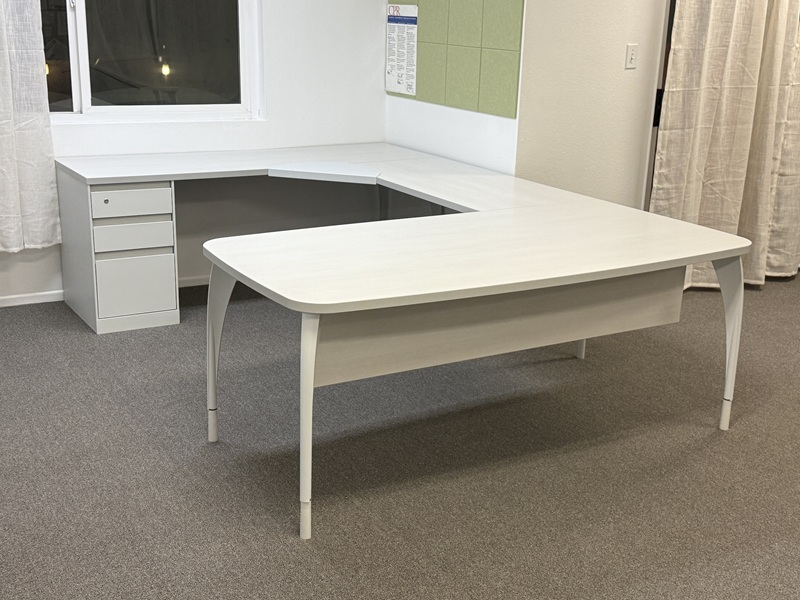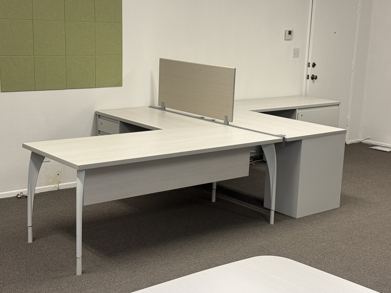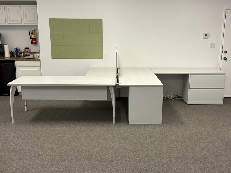 6' x 6' L shape desks with a panel in the middle and one U shaped desk and mobile meeting table.